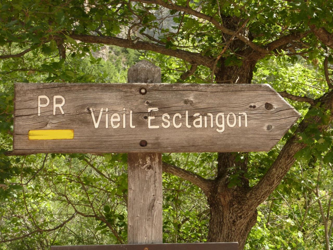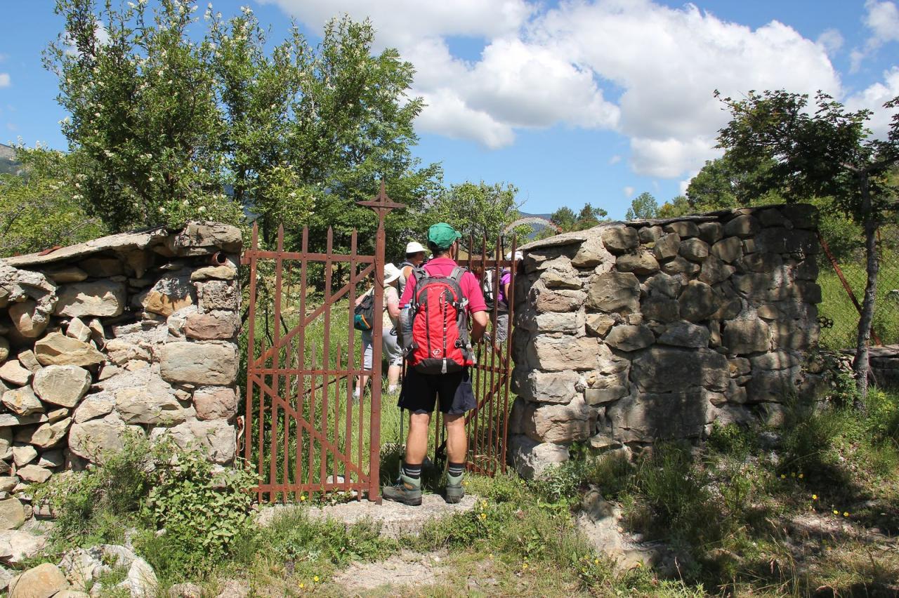 Après être passés en voiture par les spectaculaires Clues de Barles et du Pérouré, un regard vers le superbe plissement de roches qui surplombe la sortie du tunnel . Nous laissons les voitures sur le parking et nous attaquons un petit sentier qui monte en lacets dans les terres rouges. Petit sentier qui monte au milieu de formations rocheuses ressemblant à des murs de pierres. Mais ici il ne s'agit pas du travail de l'homme mais plutôt du fond d'une très ancienne mer que la formation des Alpes a mis à la verticale et à cette altitude . Un regard en arrière nous fait admirer l'enfilade des Clues surplombées par la Grande Cloche de Barles. Tout en montant la vue commence à se dégager nous faisant découvrir la curieuse "Lame de Facibelle" une feuille de pierre de plusieurs dizaines de mètres de haut dressée comme une voile de bateau. La pente s'infléchit, le chemin devient presque horizontal, on arrive près du village sur le Collet très vert, une petite pause à la seule maison restaurée nommée le "refuge d'art". Le refuge est fermé et on ne peut y rentrer que sur réservation dommage mais on aperçoit à travers la vitre salie le "Serpent d'argile" sculpté dans l’argile rouge sur le pignon de la maison. Nous arrivons enfin dans le hameau en ruine du Vieil Esclangon, village abandonné dans les années cinquante. Nous passons devant le lavoir avec une inscription étrange :" Siau dins tot ço que viu" . Après la visite du village on découvre le magnifique petit cimetière avec ses vieilles tombes perdues dans la végétation dont les plus récentes remontent aux années 30 . Nous reprenons ensuite le même trajet pour le retour vers les voitures avant de regagner Seyne.