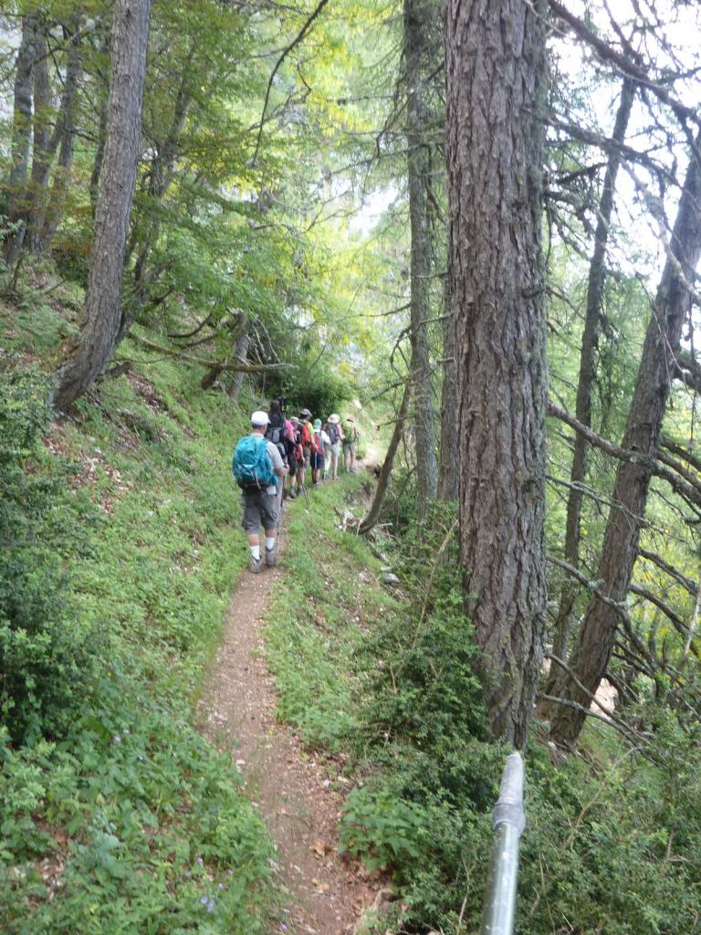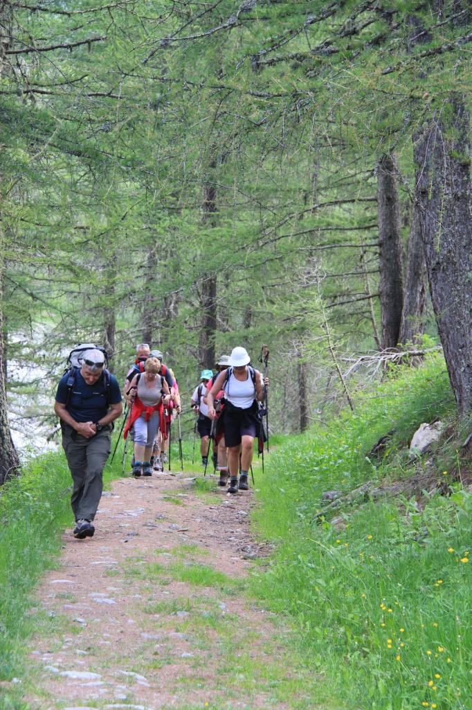 Nous laissons les voitures au parking au dessus de la maison forestière de Bellevue. Le départ de la randonnée se fait à partir du sentier balisé jaune et de la piste forestière de la Chau et prenons la piste qui part à gauche. Plus loin le sentier quitte la piste et grimpe dans la forêt à l'aplomb du télésiège de la Brèche ou nous pouvons observer deux chamois qui nous observent mais sans pour autant les inquiéter. A partir de cet endroit nous avons une magnifique vue sur la Vallée de la Blanche . Le sentier rejoint une autre piste et monte en lacets par une série de virages soutenus par de superbes murs construits par l'armée qui disposait à Dormillouse d'un fort pour surveiller tout ceux qui arrivaient par l'Ubaye. A l'arrivée à la table d'orientation nous admirons la chaîne des Ecrins en face ainsi que le lac de Serre Ponçon au dessous. Puis nous arrivons au fort de Dormillouse (2505 m). Depuis le terre-plein du fort nous faisons la pause déjeuner et devant la vue est superbe sur les lacs (à gauche le lac du Milieu, à droite le lac Noir et un splendide panorama sur l'entrée de la vallée la Grande Séolane, les Trois Évêchés, de l'Estrop ..etc.. On pourra observer aussi le vol d'un vautour fauve et très haut au dessus de nos têtes des aigles. Puis on prend la piste pour descendre vers le Lac Noir ou des pêcheurs taquinent les truites de montagne. après l'observation d'une marmotte trop curieuse nous reprenons le sentier qui nous amène jusqu'aux tourbières du Col Bas anciens lacs d'altitude situés sur un ancien cirque glaciaire et envahis de végétaux et en toile de fond la Vallée de l'Ubaye. Notre guide profite de la quiétude de l'endroit pour nous faire un petit topo sur les chiens "Patou" et leur mauvaise réputation mêlés aux troupeaux ils préservent les moutons des attaques de loups mais ne rassurent pas les randonneurs. Puis on remonte le Vallon de Provence jusqu'au Col Bas (2113 m). De Là nous redescendons vers le parking d'abord par un sentier dans les bois puis par la piste forestière qui nous fait retrouver nos voitures.