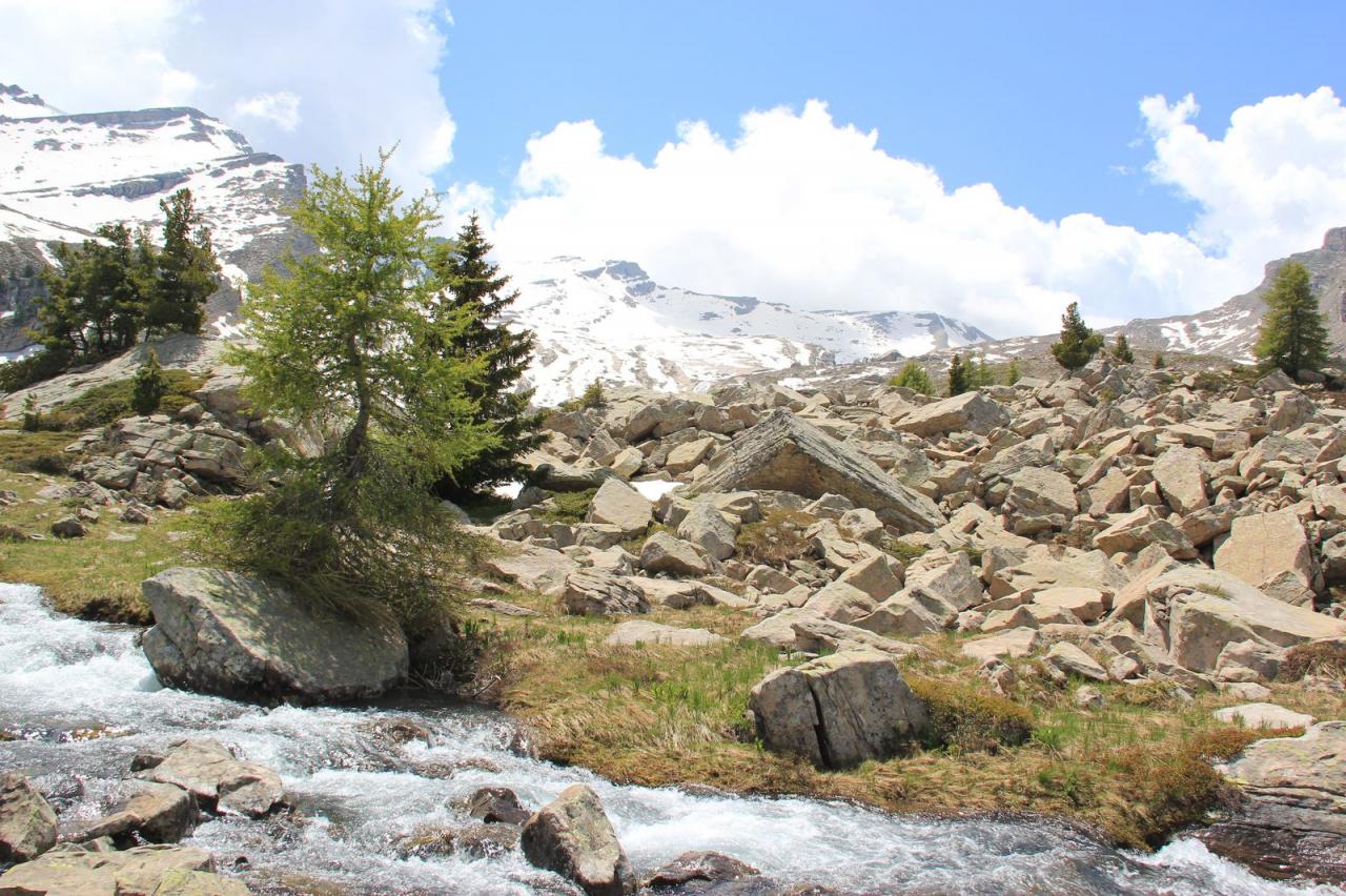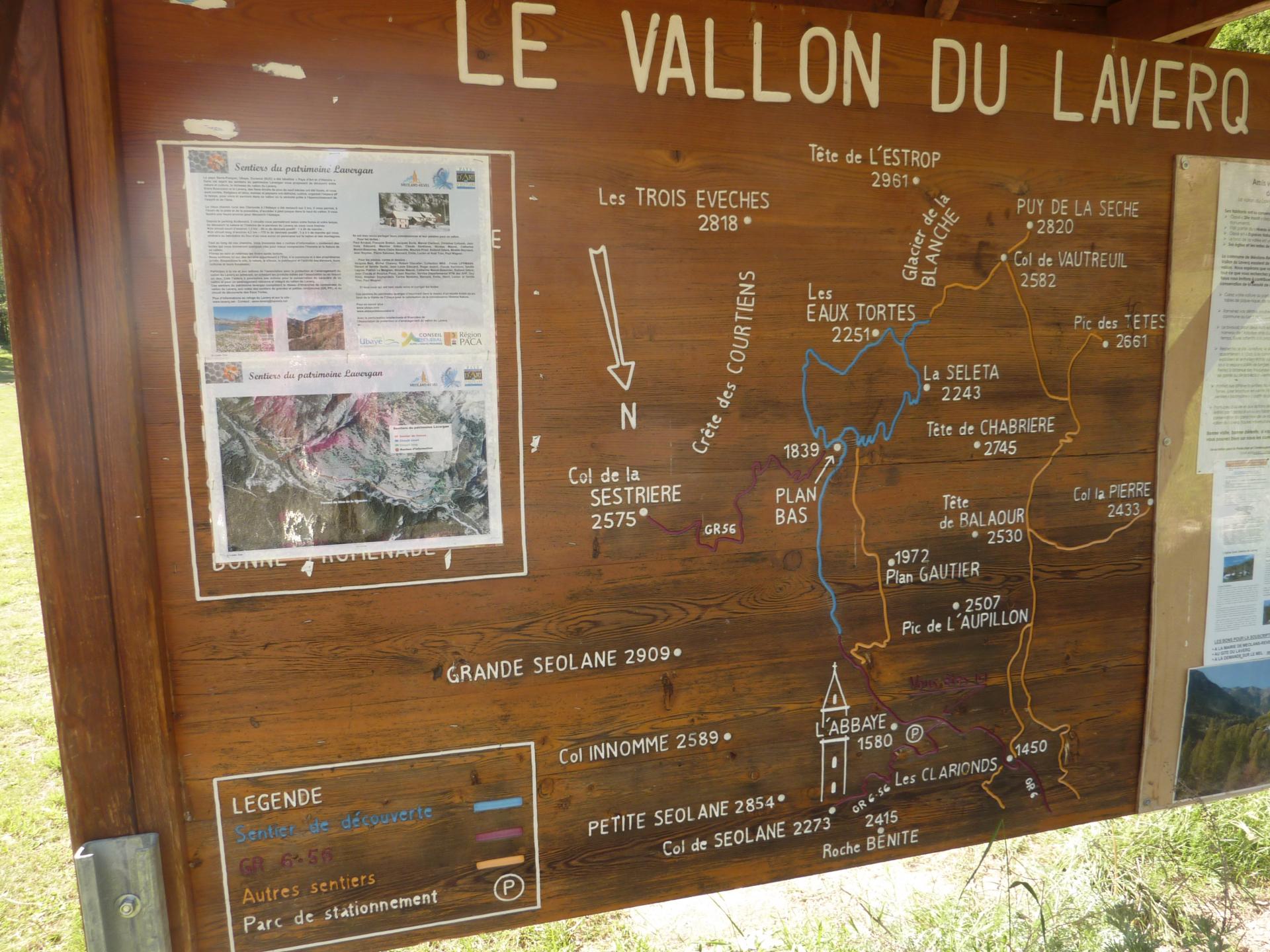 Une belle randonnée qui nous fait visiter la vallée magnifique de l'Ubaye, le Laverq puis monter jusqu'aux Eaux Tortes au pied du glacier de la Blanche. Départ depuis le deuxième parking de la piste qui emprunte le GR6 et démarre du Pont de Baud nous passons devant le refuge du Laverq avant d'arriver à l'Abbaye. Nous commençons véritablement la marche par la traversée du Vallon du Laverq en suivant le GR56 enchâssé sous les deux Séolanes . Nous y croiserons une bien jolie bergère à cheval qui gardait un important troupeau de moutons et de chèvres aidée par de magnifiques Borders Collies. Au cœur du vallon coule une rivière la Blanche de Laverq qui égaie de ses eaux limpides les alpages puis on grimpe vers Plan Bas et ses maisons forestières par un chemin en sous bois très frais et agréable et l'on atteint Plan bas et sa grande table de pique-nique pour une première pause bien méritée . Quelques centaines de hectomètres après on sort de la forêt pour atteindre le point de vue sur la cascade du Ravin de Lausas dont on franchira ensuite le cours difficilement car la traversée n'est pas encore aménagée . Un peu plus haut nous zigzaguons dans un extraordinaire chaos rocheux formé de blocs de grès. Enfin on débouche sur les Eaux Tortes (2251m), un ancien cirque glaciaire où le torrent forme de multiples méandres dans l'herbe (d'où le nom qui signifie Eaux Tordues). La montée bien que régulière mais éprouvante dans sa longueur a fatigué les organismes et le pique nique du midi près de l'eau est le bienvenu. Après une courte sieste on quitte les Eaux Tortes en traversant un ruisseau à gué pour passer en contrebas du glacier de la Blanche (le dernier des Alpes de Haute Provence) collé contre le flanc de la tête de l'Estrop (2961m). Enfin on redescend par une vallée un peu plus à l'ouest, le long d'un sentier escarpé en traversant une magnifique forêt de mélèzes et certains arbres couchés encombrent le sentier ce qui ajoute quelques difficultés supplémentaires. Au bout d'une descente éprouvante nous retrouvons le torrent au Plan Bas. Après avoir traversé le torrent par une jolie petite passerelle de bois nous empruntons le long chemin de retour à travers le vallon pour rejoindre l'Abbaye et un peu plus bas le parking et clôturer une bien belle rando, longue mais à ne pas manquer.