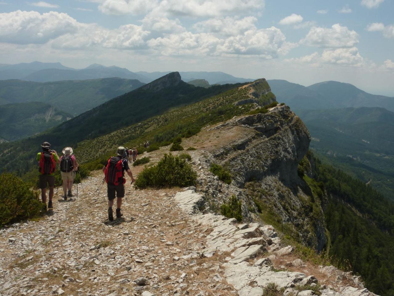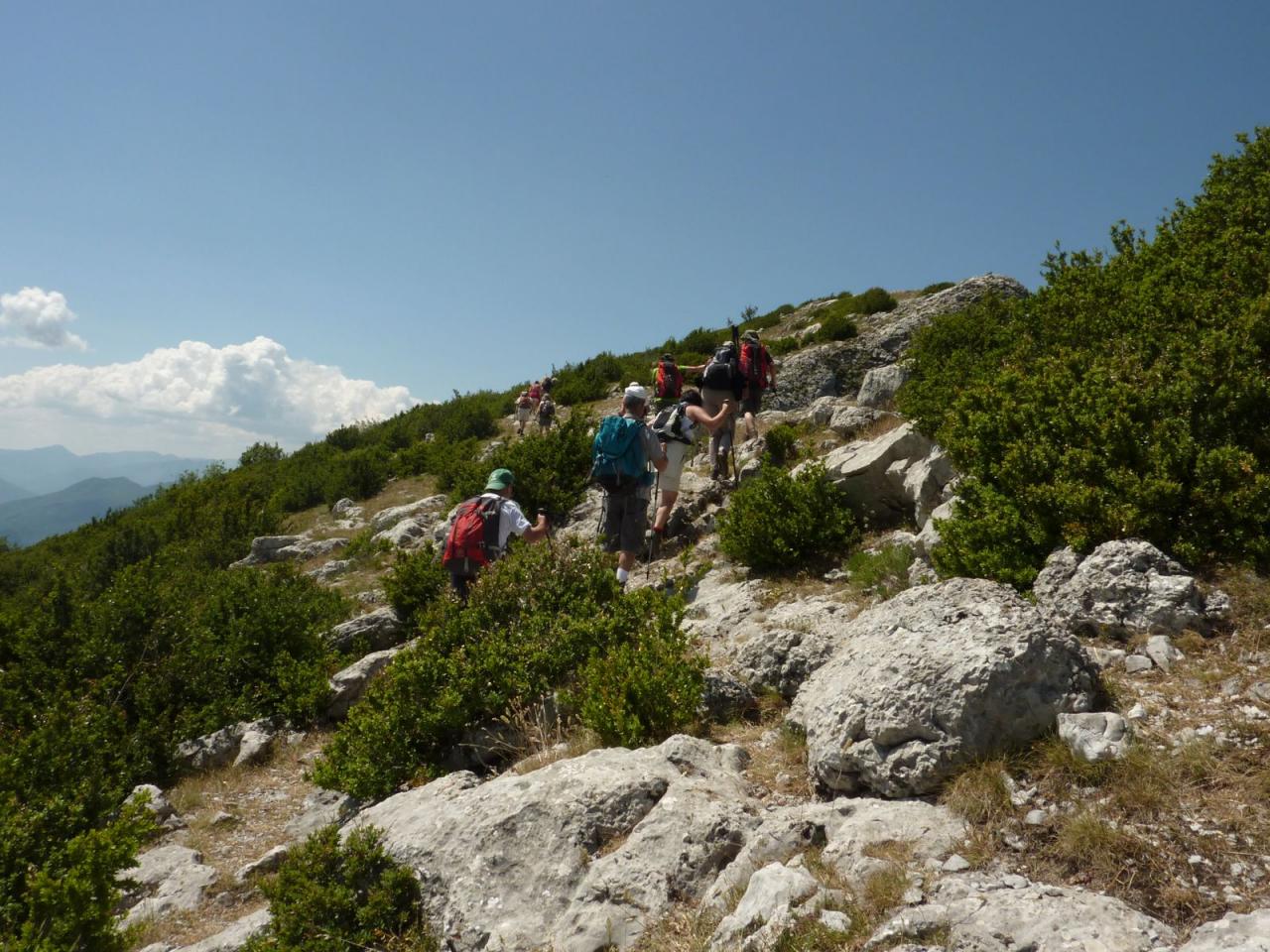 Au-dessus de Dignes-Les-Bains, la Barre des Dourbes s'étire sur 17 kms et culmine à 1728m. Pour cette dernière randonnée nous laissons les voitures au parking de la maison forestière du Serre(1096m). Large au départ le chemin forestier est facile et emprunte le chemin de "La Grande Traversée Pré-Alpes "(GTPA) balisé en rouge et jaune, c'est un large chemin entre pins et hêtres. Ensuite le chemin devient plus étroit vers le haut, on se demande bien comment nous allons pouvoir grimper sur la barre qui paraît bien inaccessible, et on ne va pas tarder à le savoir. Le final à flanc de falaise peut impressionner, cette partie n'est pas très longue, délicate mais ne présente aucune difficulté technique. En arrivant au Pas de la Faye (1690m), un vaste panorama s'ouvre sur les Alpes provençales, le Mont Ventoux, la montagne Sainte Victoire et le massif des Ecrins . Sur la crête, buis et genêts festonnent le long du sentier non balisé qui est parfois vertigineux. A mi-chemin vers le Pas de Tartonne l'érosion a creusé un entonnoir très raide, le Trou de Saint Martin (1700m), ainsi nommé car selon la légende les rayons du soleil perforent la Barre à cet endroit le jour de sa fête, le 11 novembre. Après notre pique-nique du midi bien mérité sous un soleil ardent sans un pouce d'ombre, on ne s'attarde pas et nous continuons notre chemin le long de la barre jusqu’au Pas de Tartonne (1658m) et de là nous redescendons par un sentier en lacets au départ un peu difficile car très pierreux mais sans réel danger. Au fur et à mesure de la descente il deviendra de plus en plus facile et très agréable car il serpentera à travers une forêt de pins et de hêtres pour rejoindre le GTPA jusqu'à notre point de départ.
