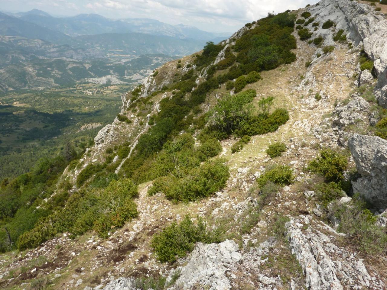 Vient maintenant le moment de gravir la Grande Cloche, tout d'abord par un sentier à flanc de montagne qui nous emmène jusqu'au bord de la falaise que l'on longe ensuite pour enfin arriver au sommet (1887 m) et profiter d'un superbe panorama sur tout le sud des Alpes et du vol d'un vautour fauve. Magnifique vue sur la vallée du Bès avec Barles bien à l'abri, la Chaîne de la Blanche qui barre l'horizon. Du sommet on surplombe la Petite Cloche avec tout au fond le massif des Écrins et ses glaciers.